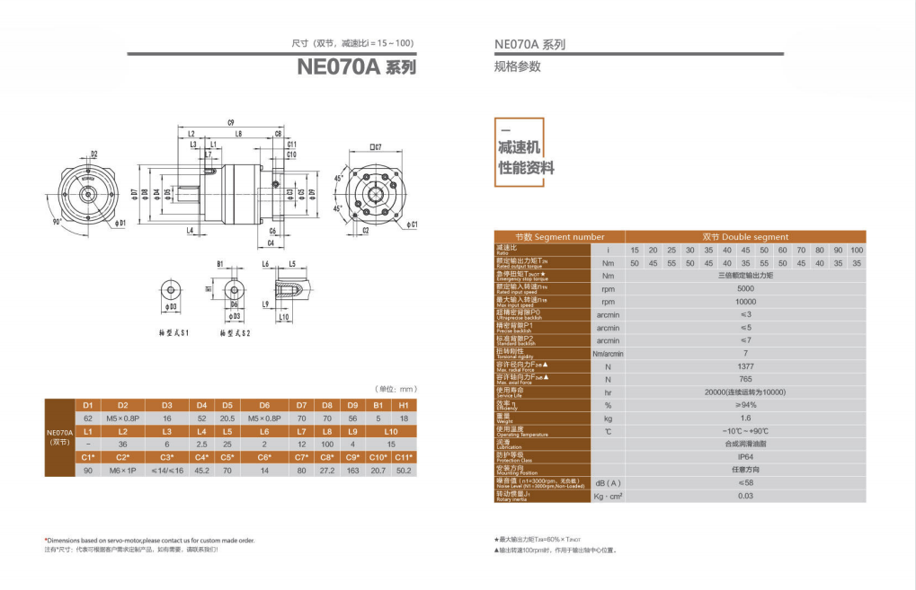 NE070A系列超精密背隙行星减速机系列(P0): NE070A系列精密背隙行星减速器系列(P1): NE070A系列标准背隙行星减速机系列(P2):