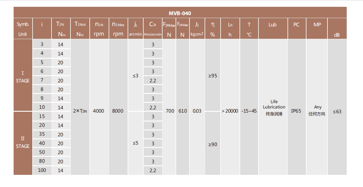 MVB-040-L2系列超精密背隙行星减速机系列(P0): MVB-040-L2系列精密背隙行星减速器系列(P1): MVB-040-L2系列标准背隙行星减速机系列(P2):