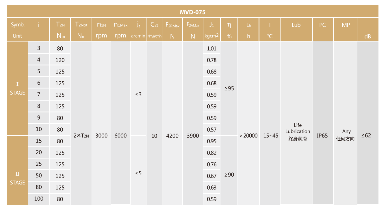 MVD-075-L2系列超精密背隙行星减速机系列(P0): MVD-075-L2系列精密背隙行星减速器系列(P1): MVD-075-L2系列标准背隙行星减速机系列(P2):