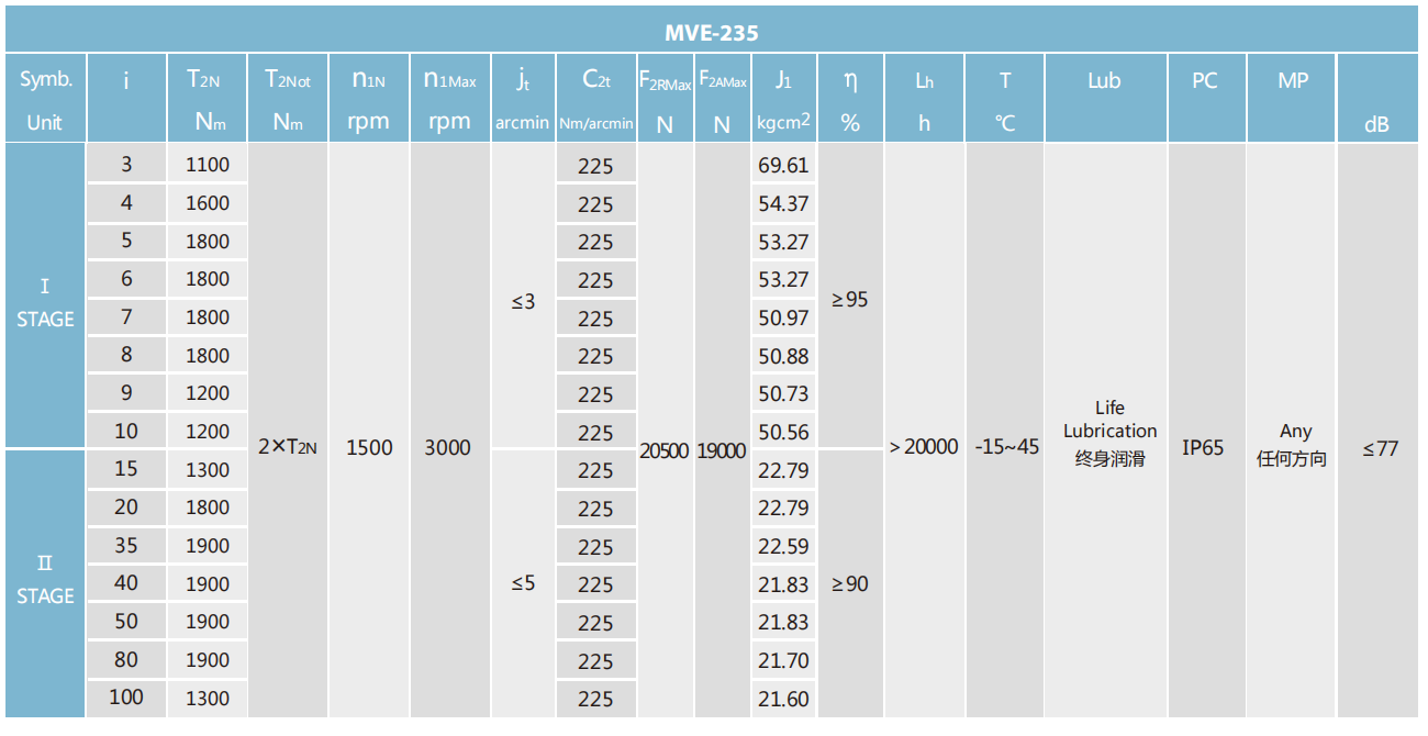 MVE-235-L1系列超精密背隙行星减速机系列(P0): MVE-235-L1系列精密背隙行星减速器系列(P1): MVE-235-L1系列标准背隙行星减速机系列(P2):