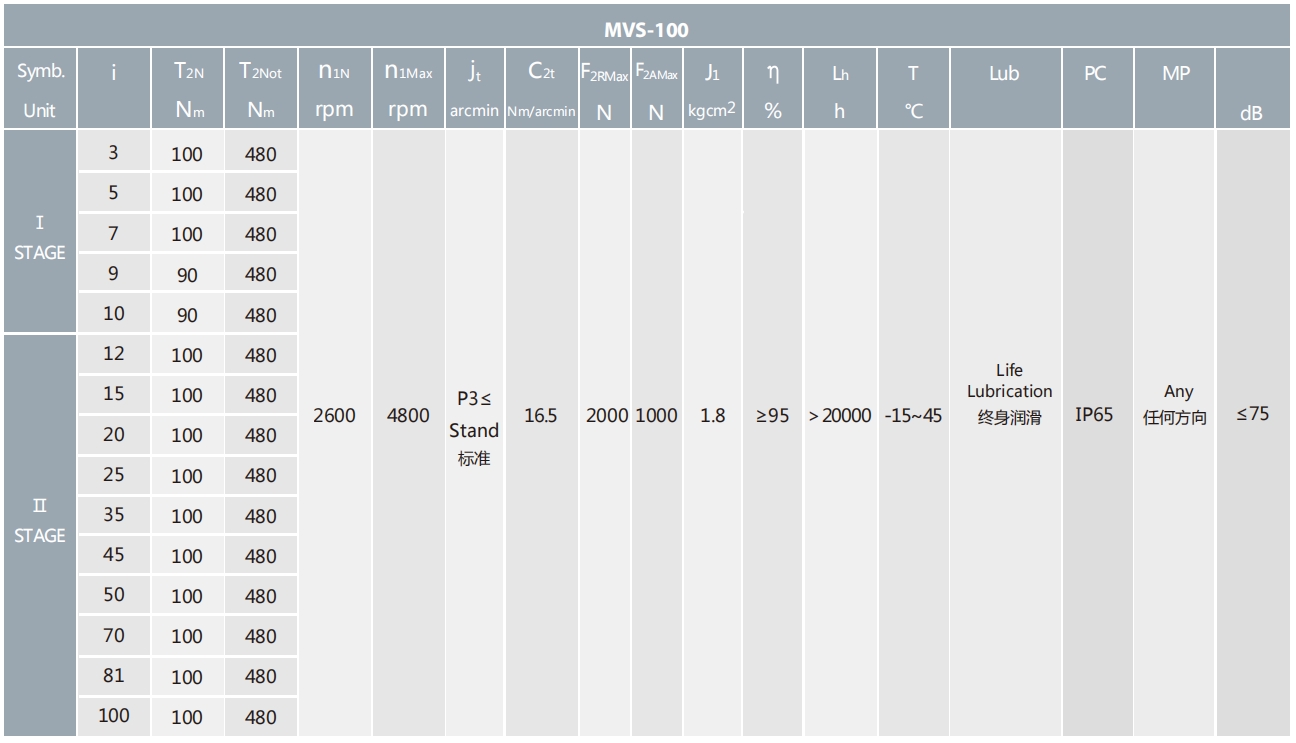 MVS-100-L2系列超精密背隙行星减速机系列(P0): MVS-100-L2系列精密背隙行星减速器系列(P1): MVS-100-L2系列标准背隙行星减速机系列(P2):