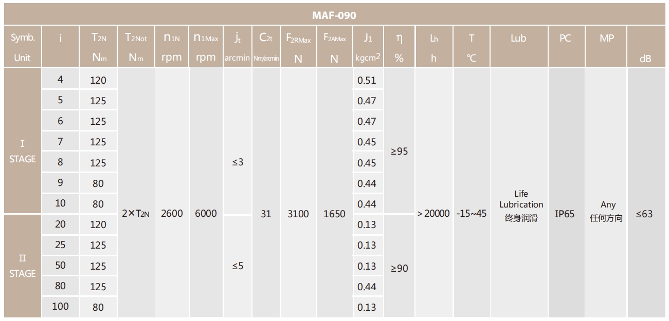 MAF-090-L1系列超精密背隙行星减速机系列(P0): MAF-090-L1系列精密背隙行星减速器系列(P1): MAF-090-L1系列标准背隙行星减速机系列(P2):