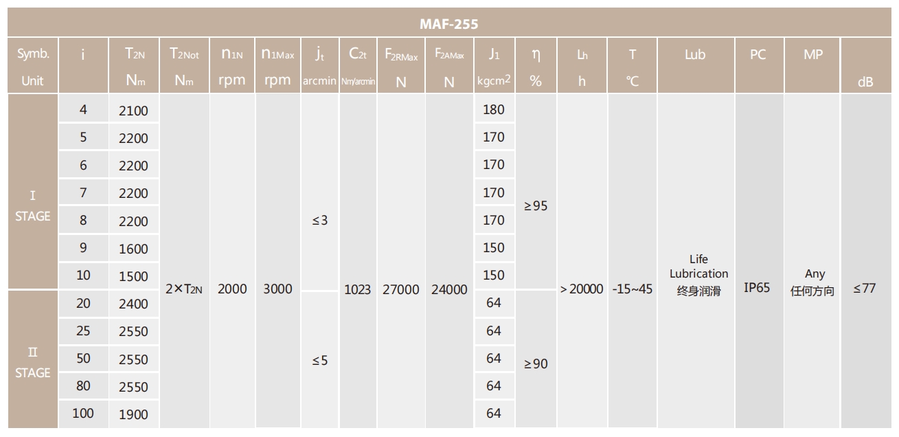 MAF-255-L1系列超精密背隙行星减速机系列(P0): MAF-255-L1系列精密背隙行星减速器系列(P1): MAF-255-L1系列标准背隙行星减速机系列(P2):