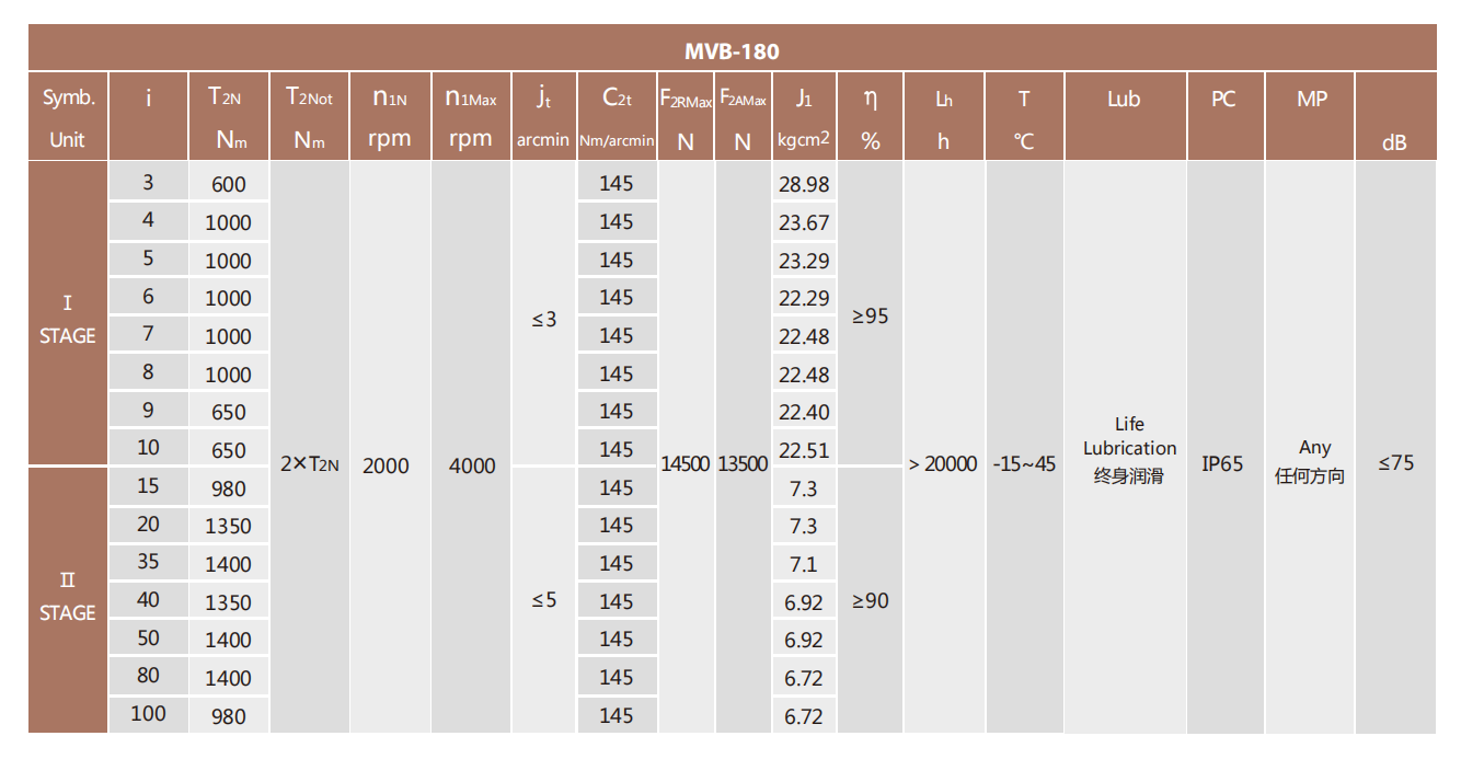 MVB-180-L1系列超精密背隙行星减速机系列(P0): MVB-180-L1系列精密背隙行星减速器系列(P1): MVB-180-L1系列标准背隙行星减速机系列(P2):